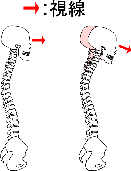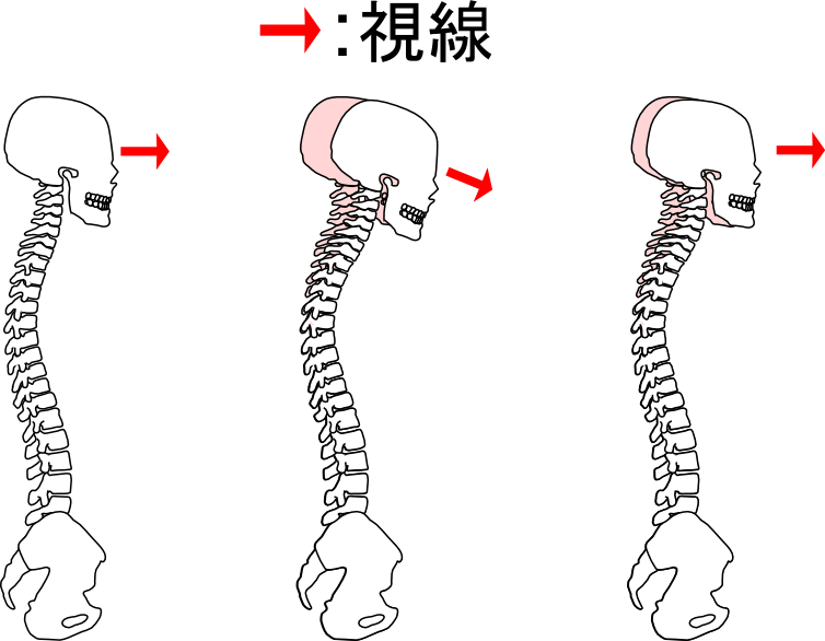 つまり、一番右の状態は視線は正面を向いているが、猫背は改善されず、頭だけが正面を向いてしまっているのです。