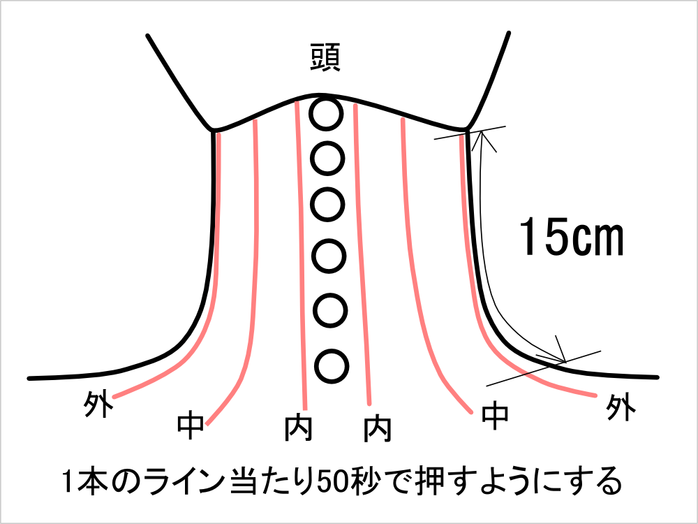 首の頭側から肩側まで15センチあると考えて、指の太さが2~3センチほど。という事は最低5~7回押せば首の頭側から肩側まで隅々までもれなく押すことが出来る。
