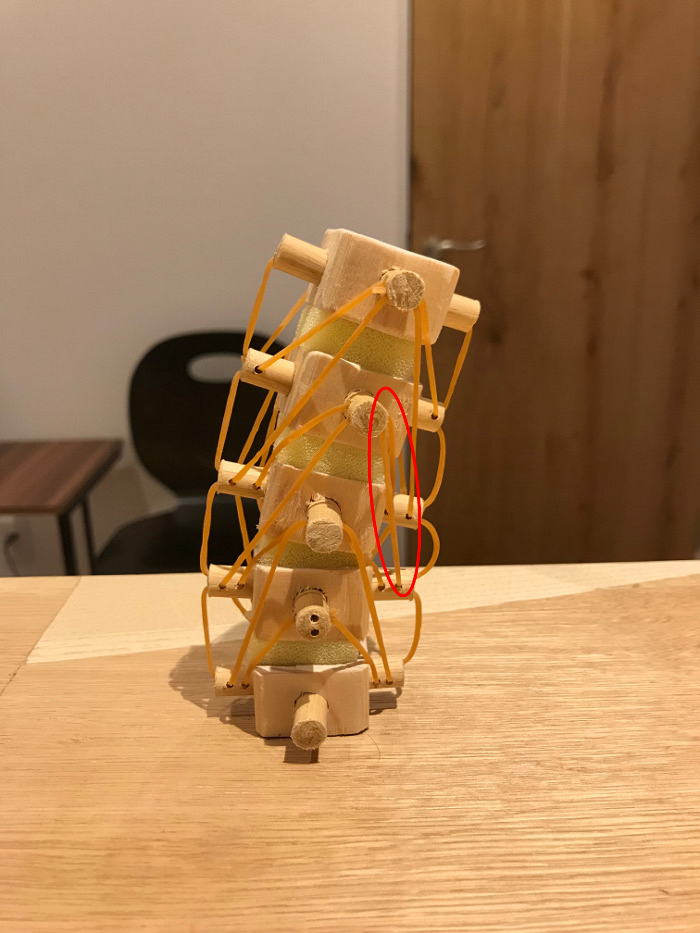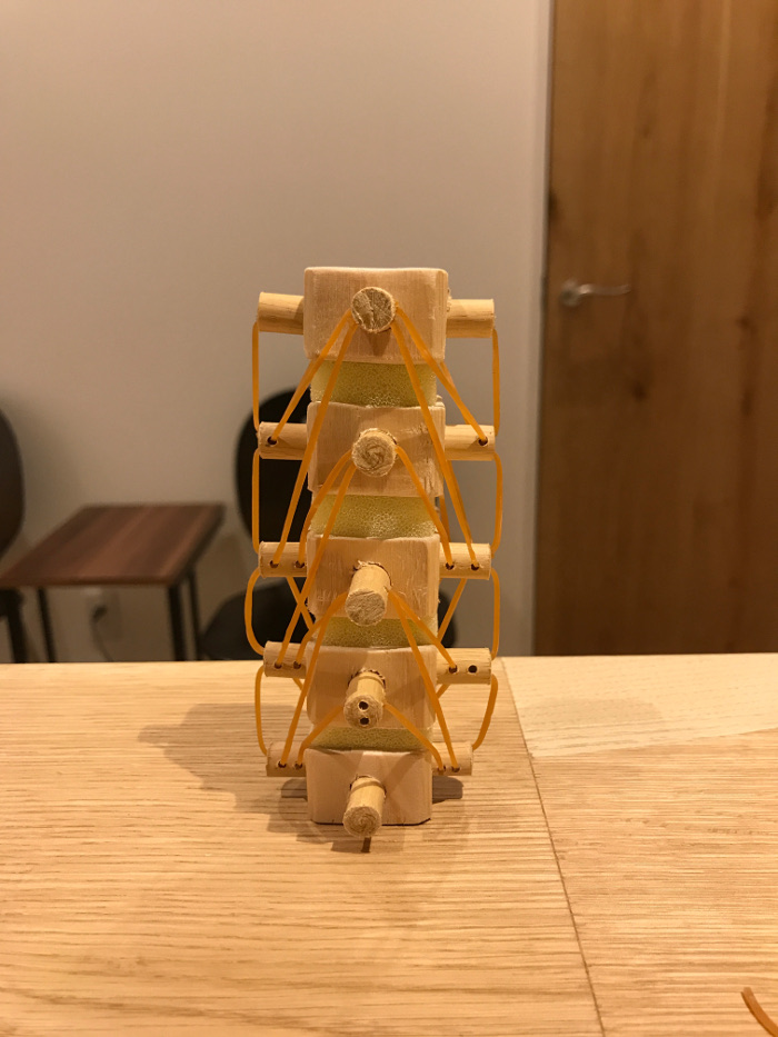 そして、背骨と背骨の間に黄色いスポンジが挟まっていますが、軟骨(椎間板)だと思ってください。
